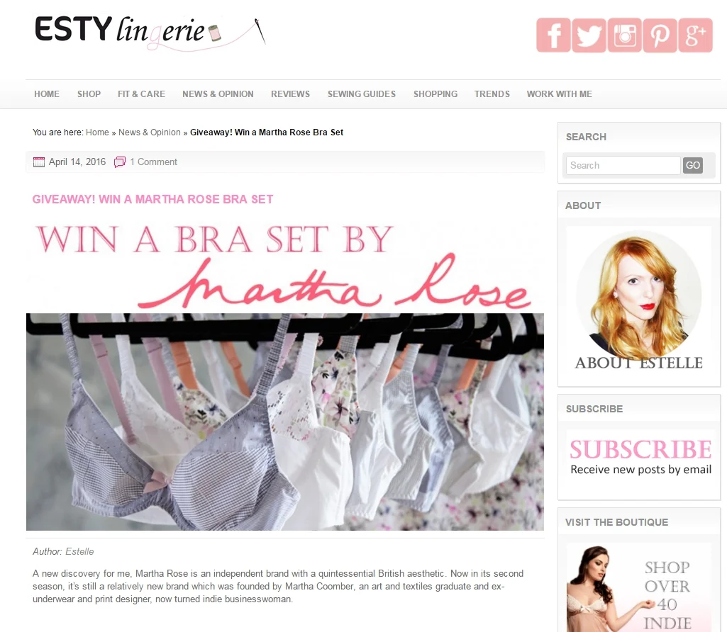 A wonderful feature about Martha Rose Underwear on estylingerie.com & we have teamed up to giveaway a bra set, to enter simply comment with your favourite set and colour way on the the featured blog post - link below -